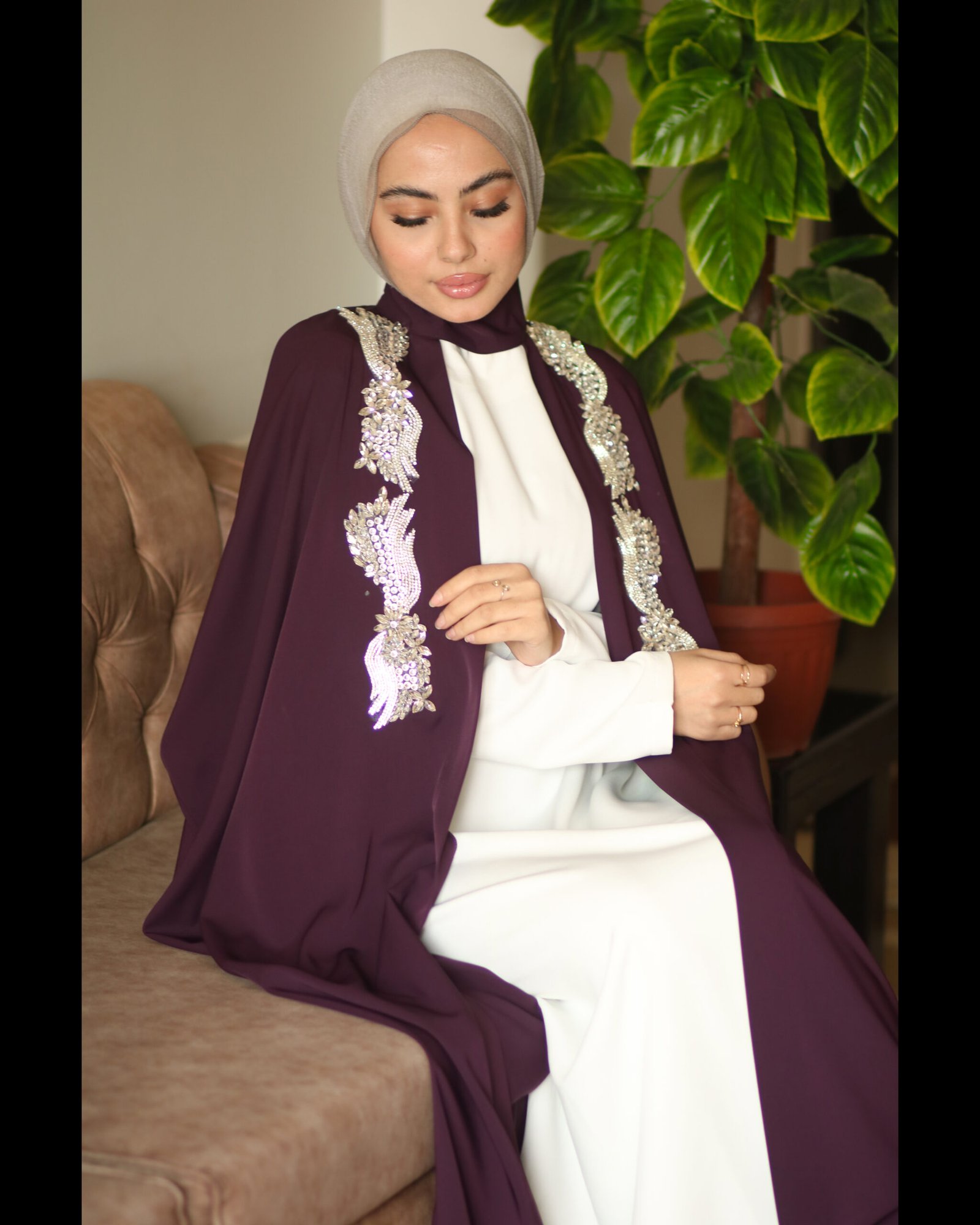 مصنوعة من قماش برادا الفاخر بلون بنفسجي ملكي (Deep Plum)، ومزيّنة بلمسات كريستال تضيف إشراقة أنيقة، مع قصّة Free Size تجمع بين الراحة والرقي.