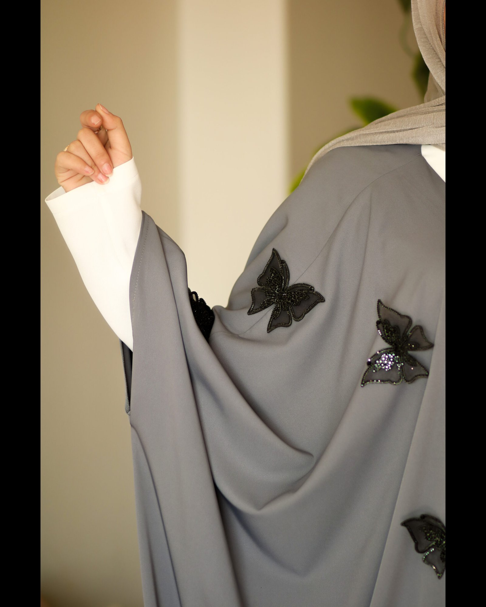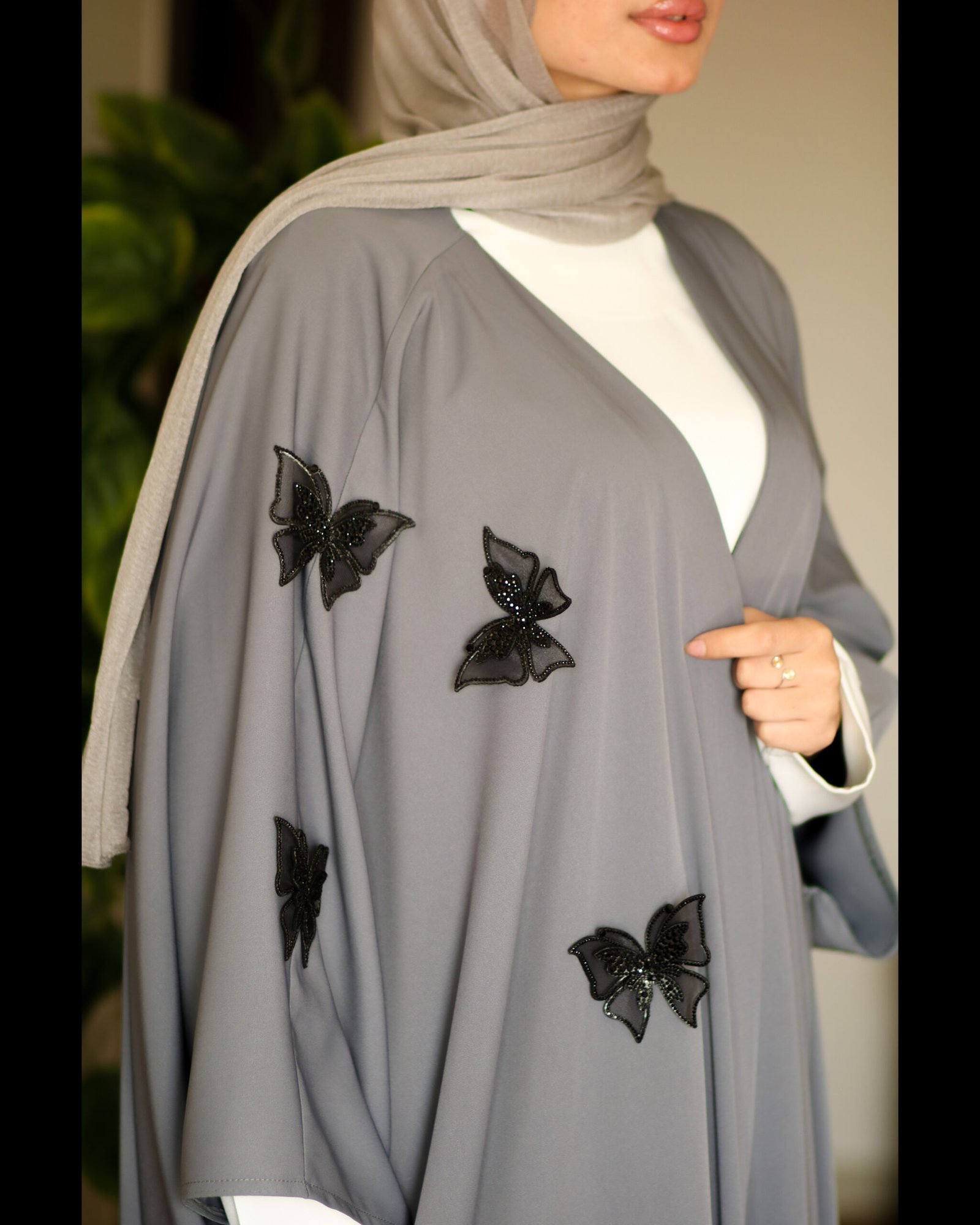 عباية رفيف مستوحاة من نعومة وخفّة أجنحة الفراشات، بتصميم ينساب برقي مع كل خطوة ليمنحكِ إحساسًا أنثويًا هادئًا وأناقة ناعمة لا تُنسى.