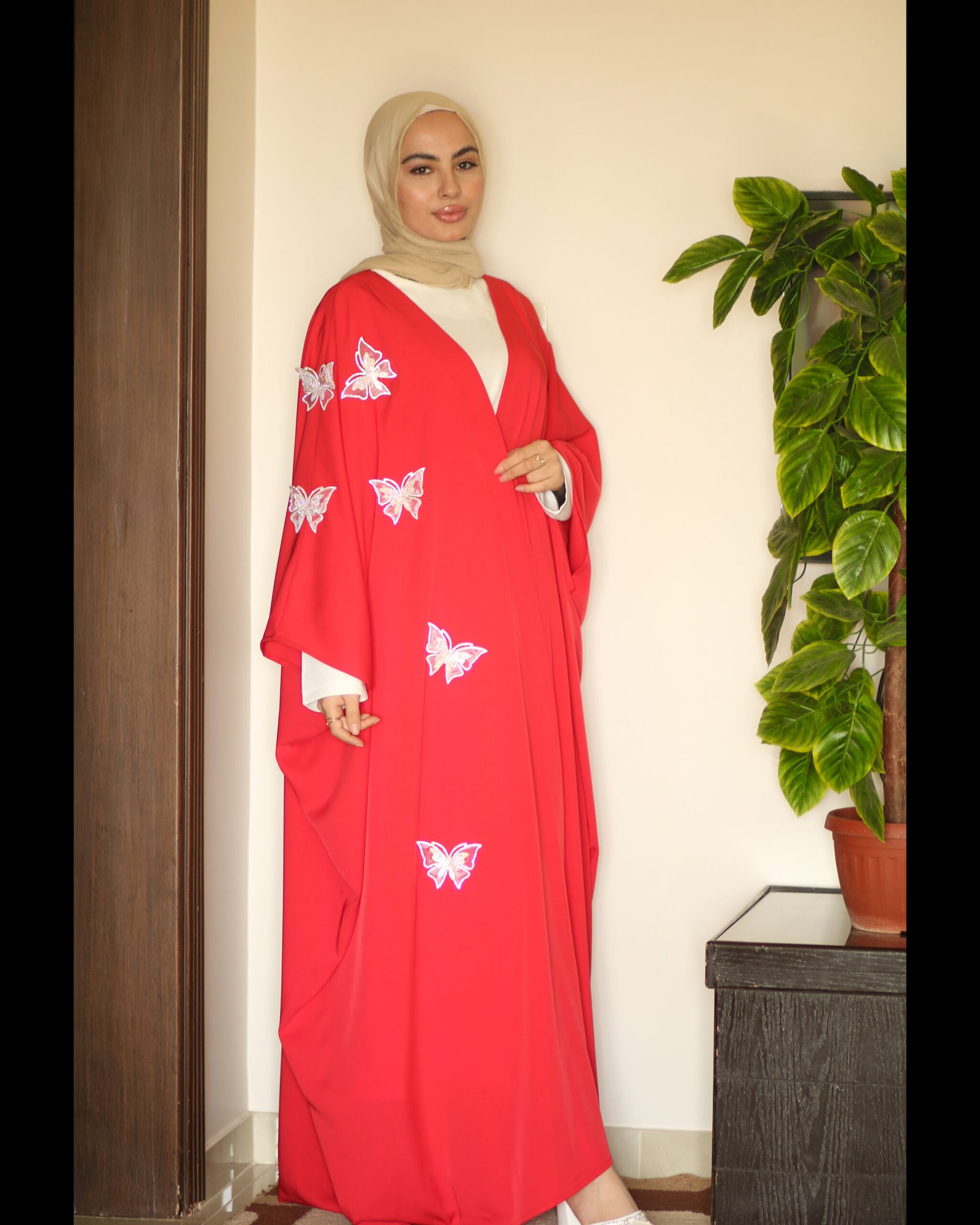 مصنوعة من قماش برادا الفاخر بلوني الرمادي والأحمر الكرزي، بقصّة Free Size تجمع الراحة مع الأناقة، ومزيّنة بتفاصيل فراشات راقية تضيف لمسة مميّزة.
